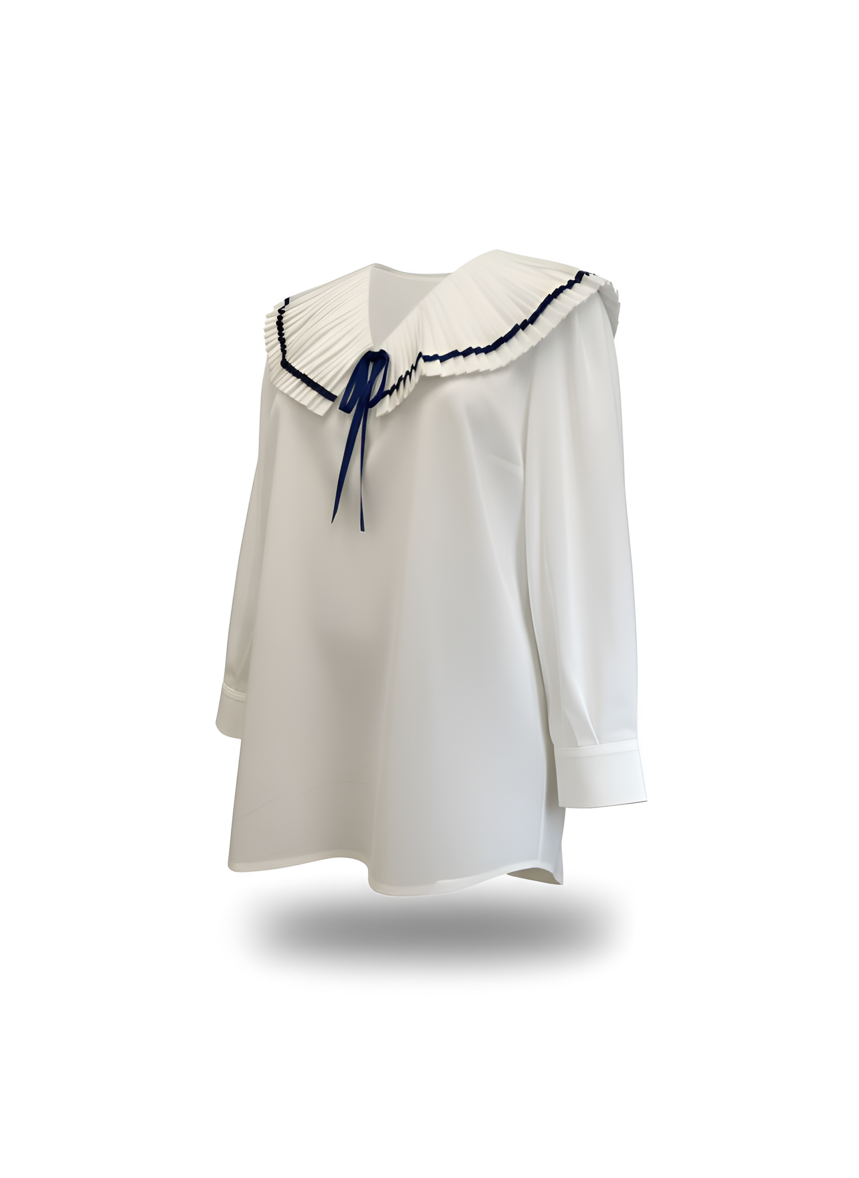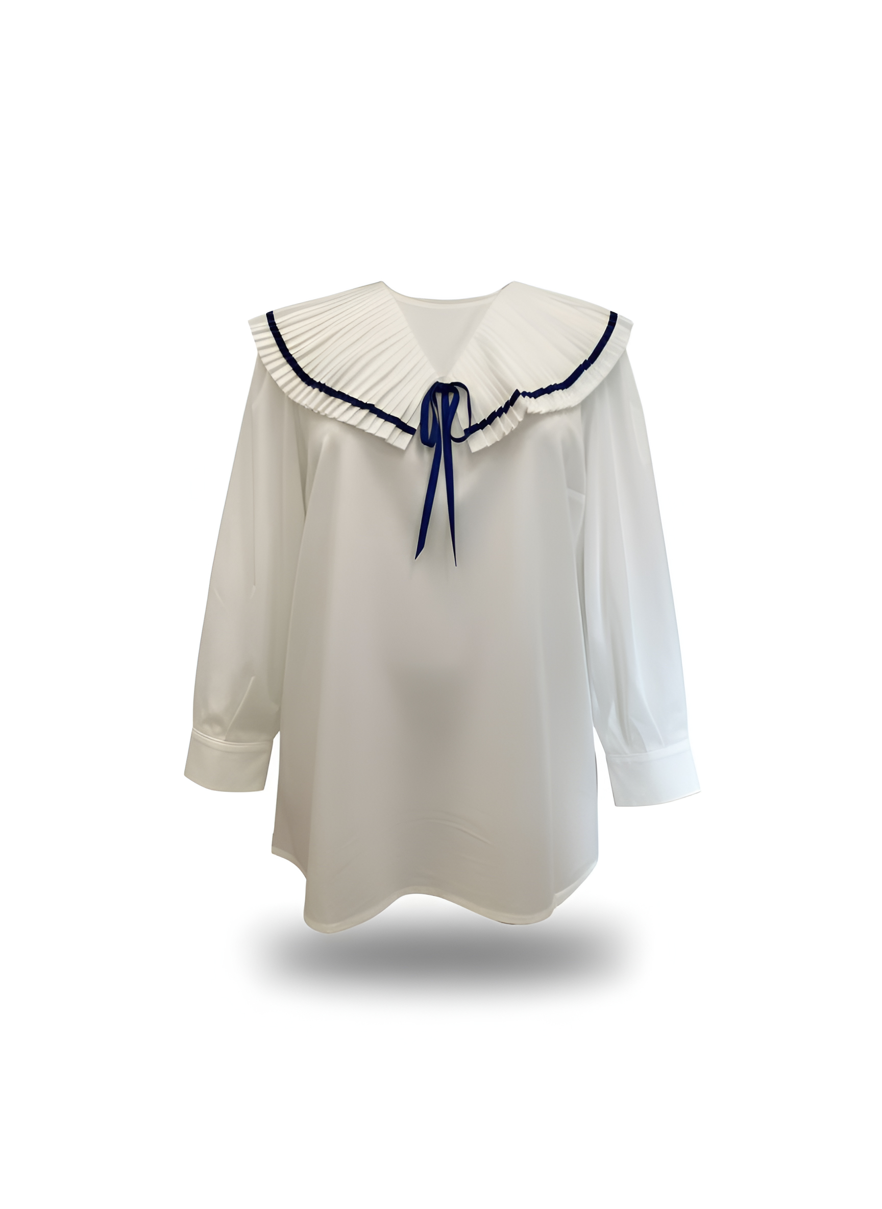 Blusa blanca en tejido de algodón popelin, con detalle de plisado abierto y ribete azul en el cuello.
