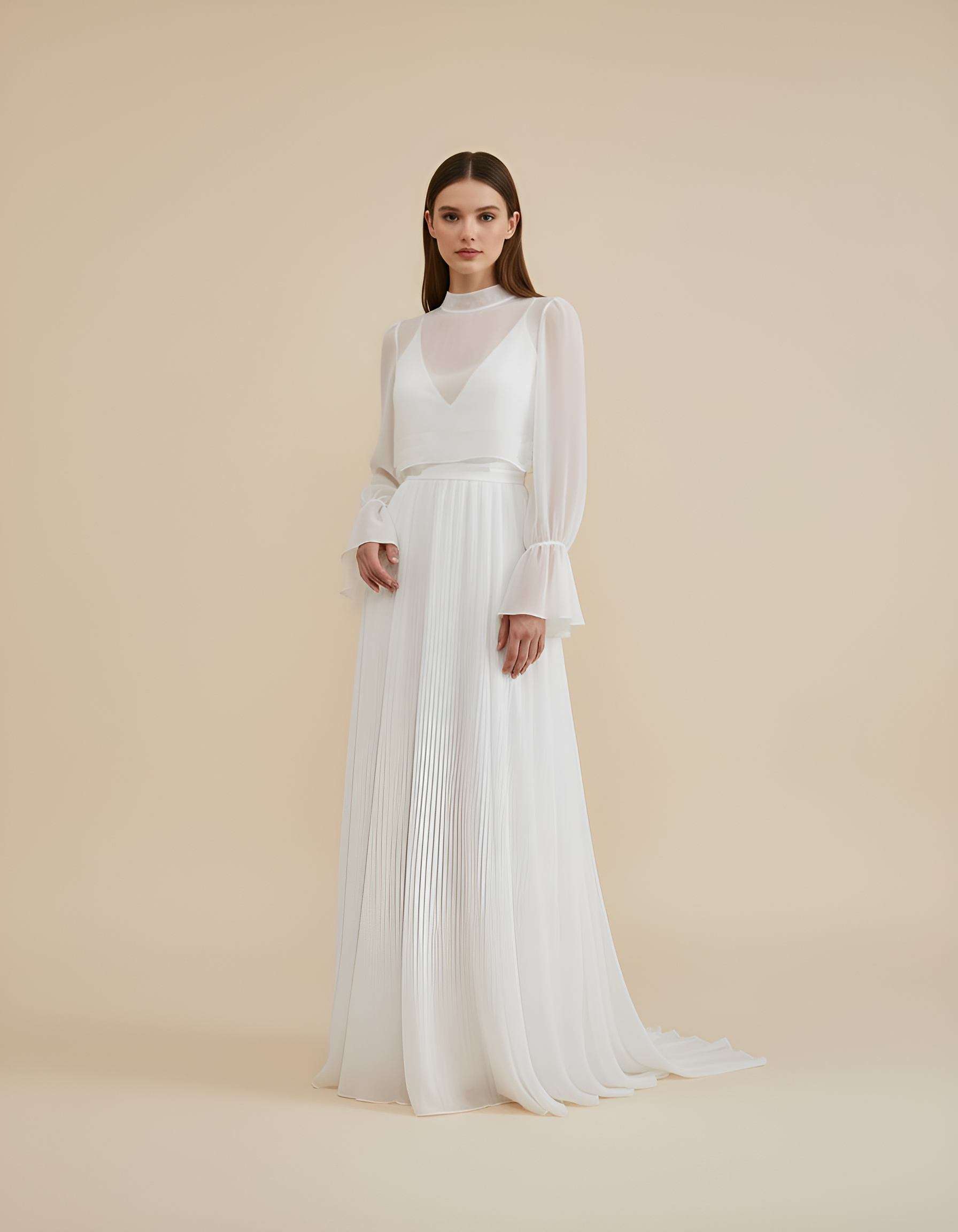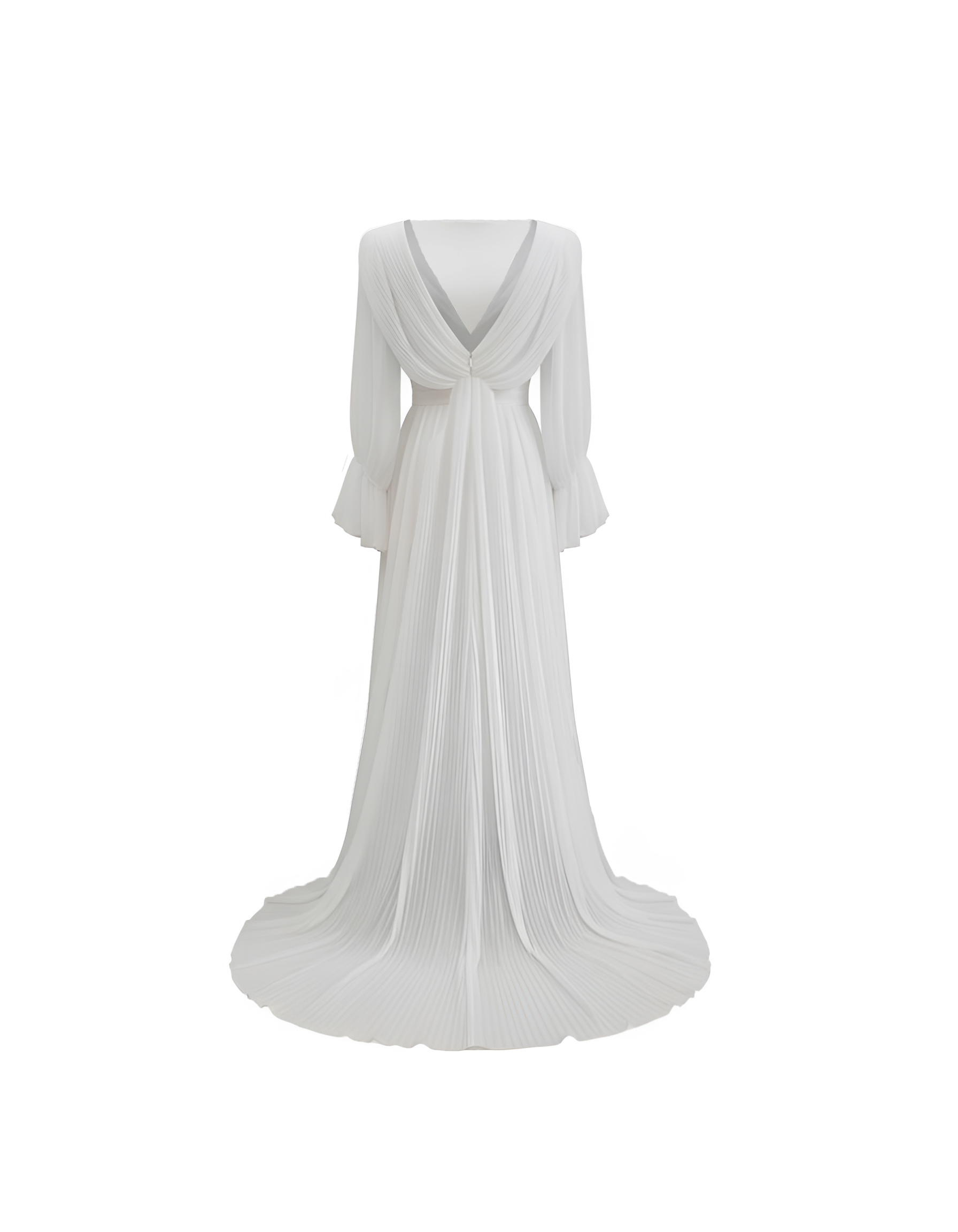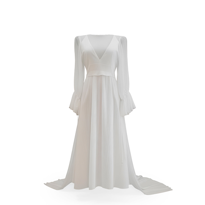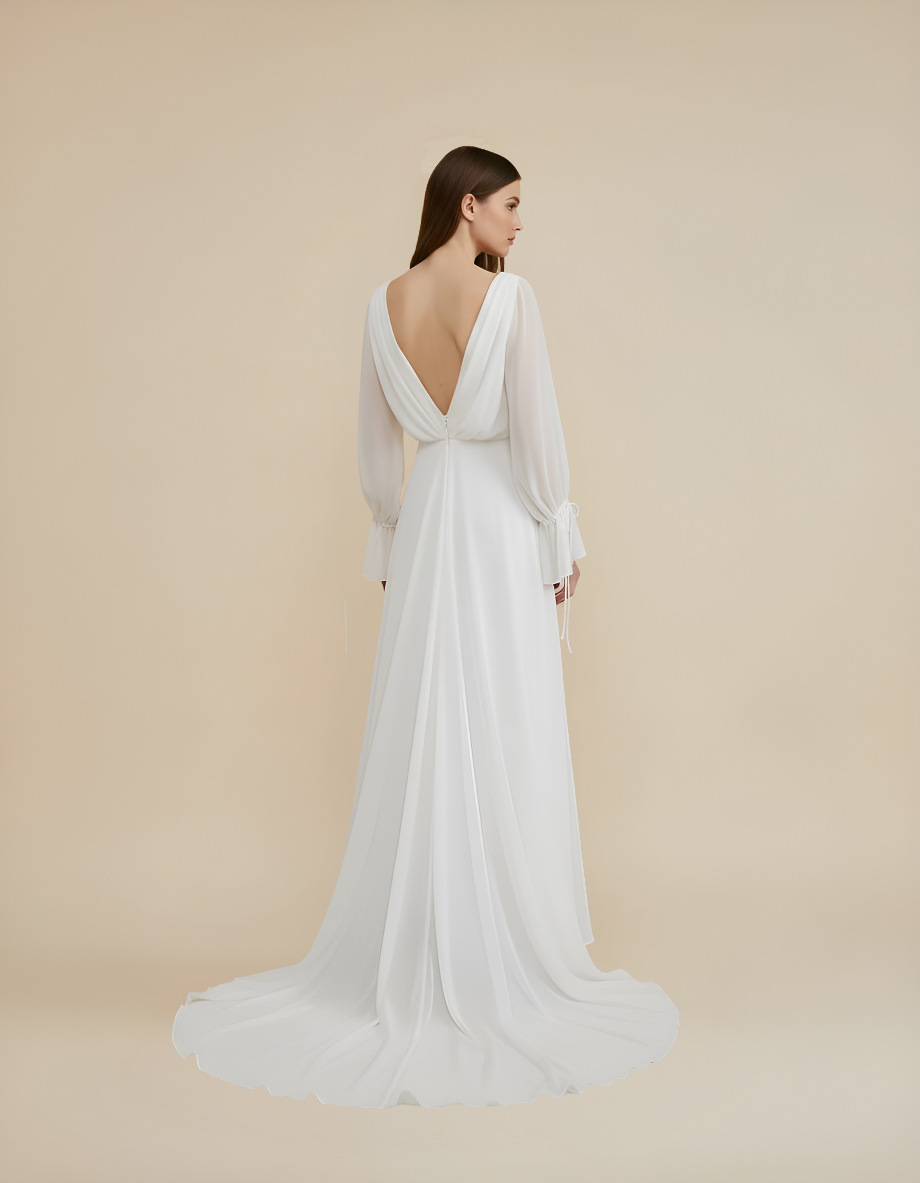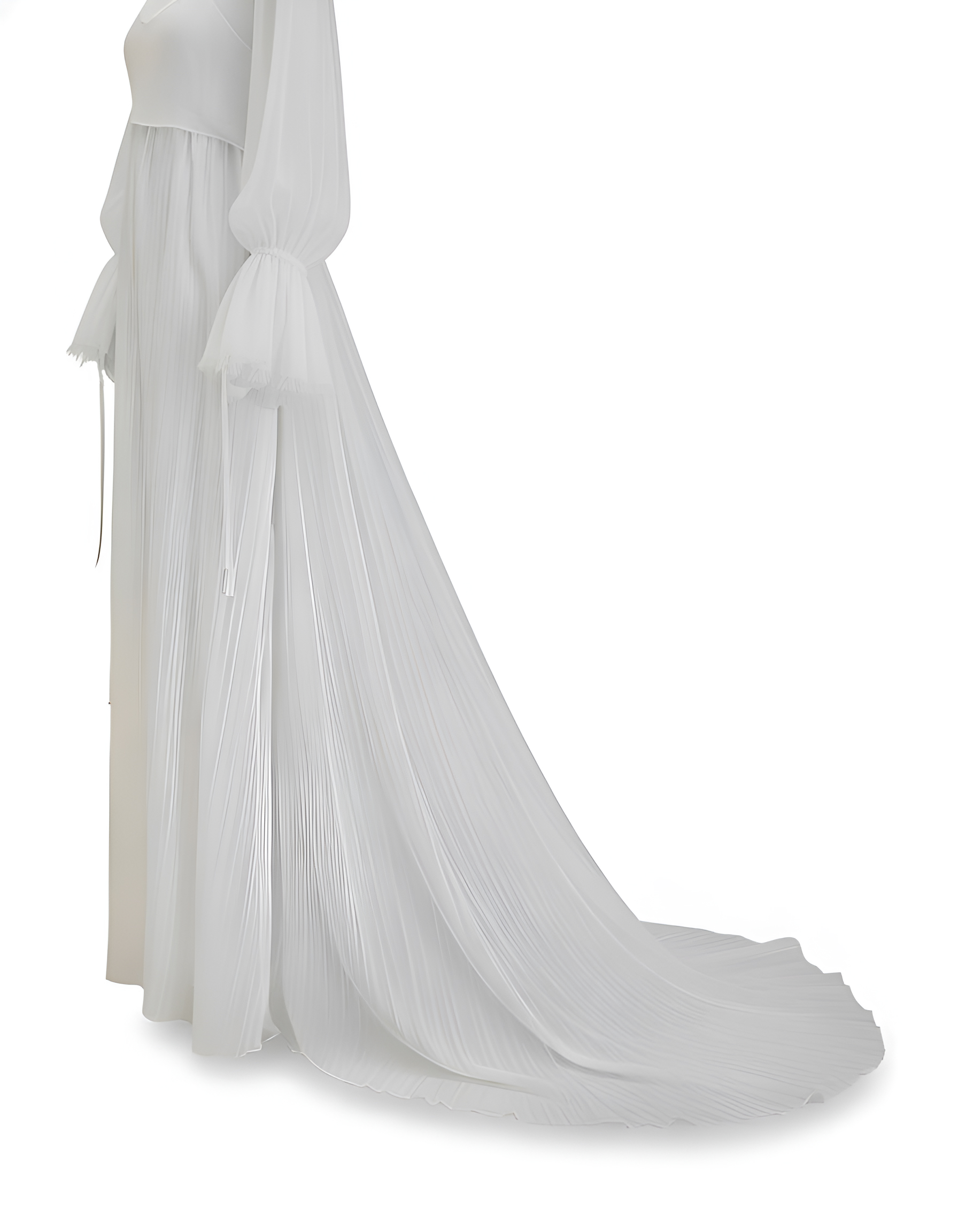 Bolero de novia en gasa bambula. Largo delantero a cintura y cola 2 metros desde cintura. Cuello forma barco y escote en espalda.