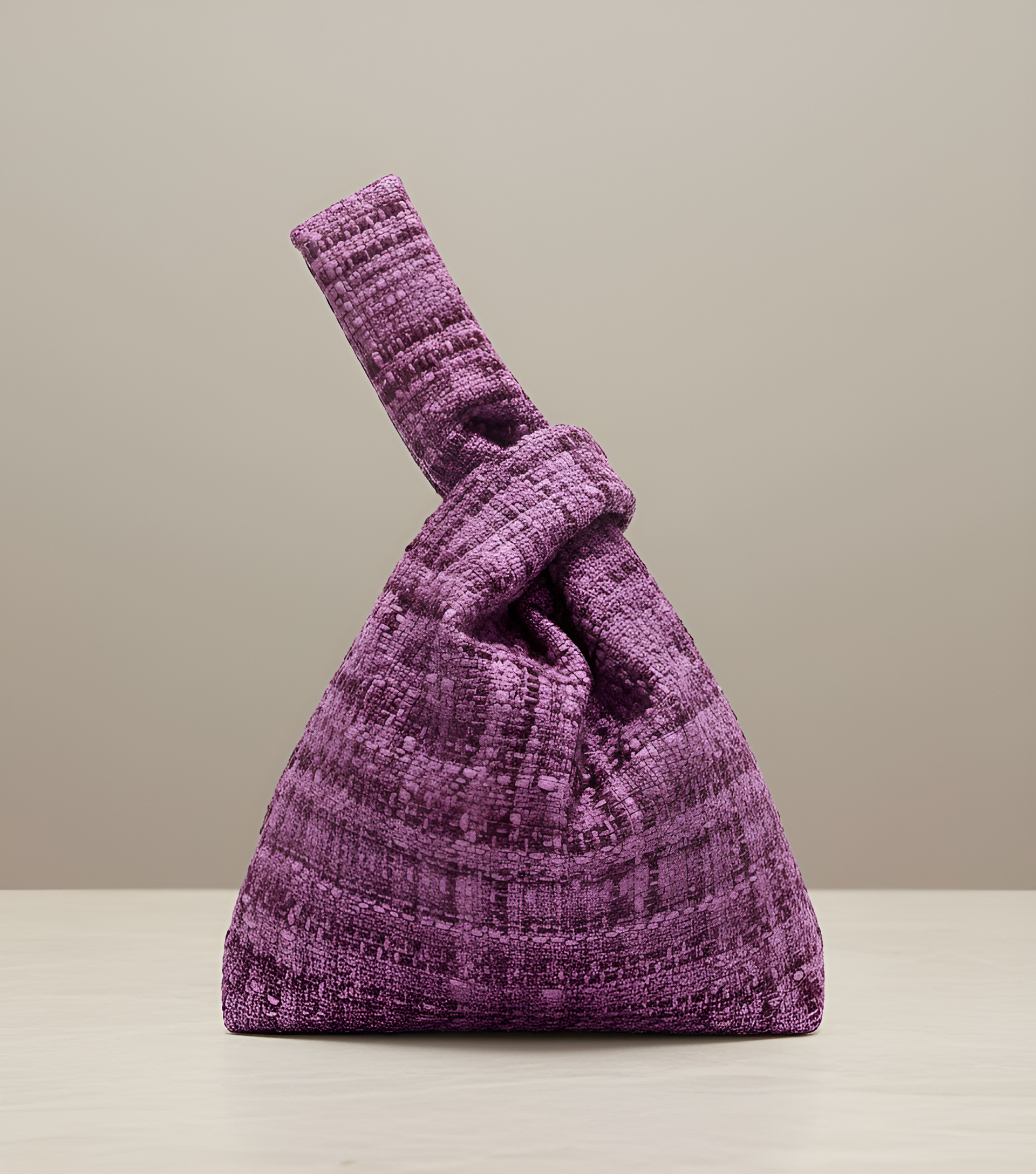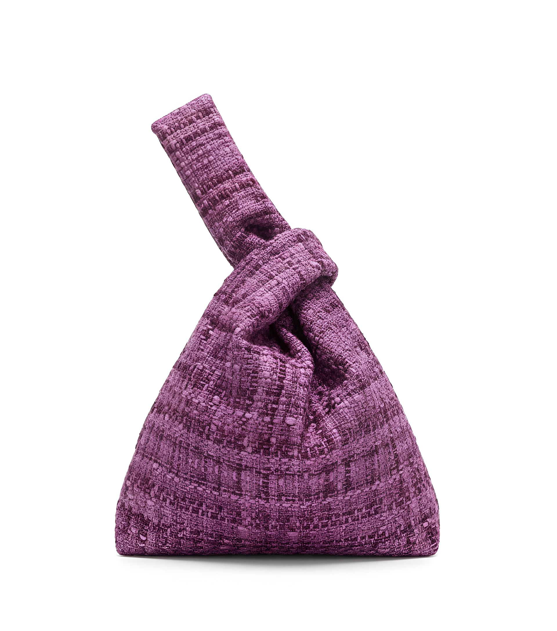 Bolso de mano estilo bombonera, en tejido tweed y color morado.