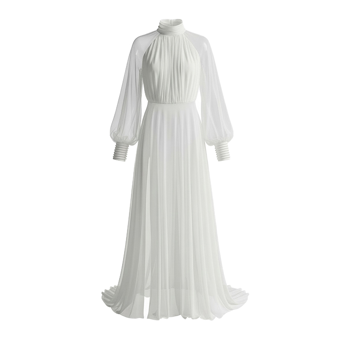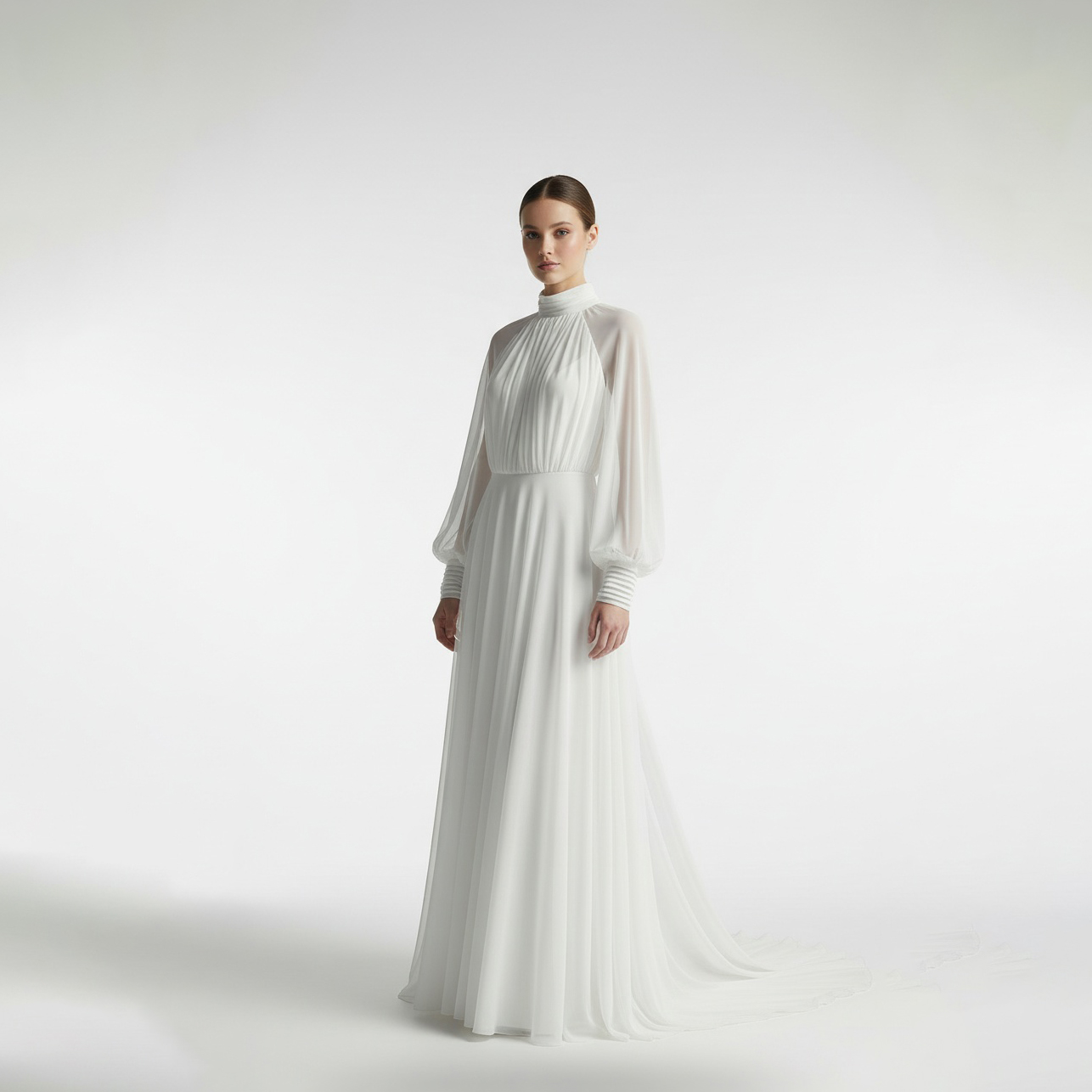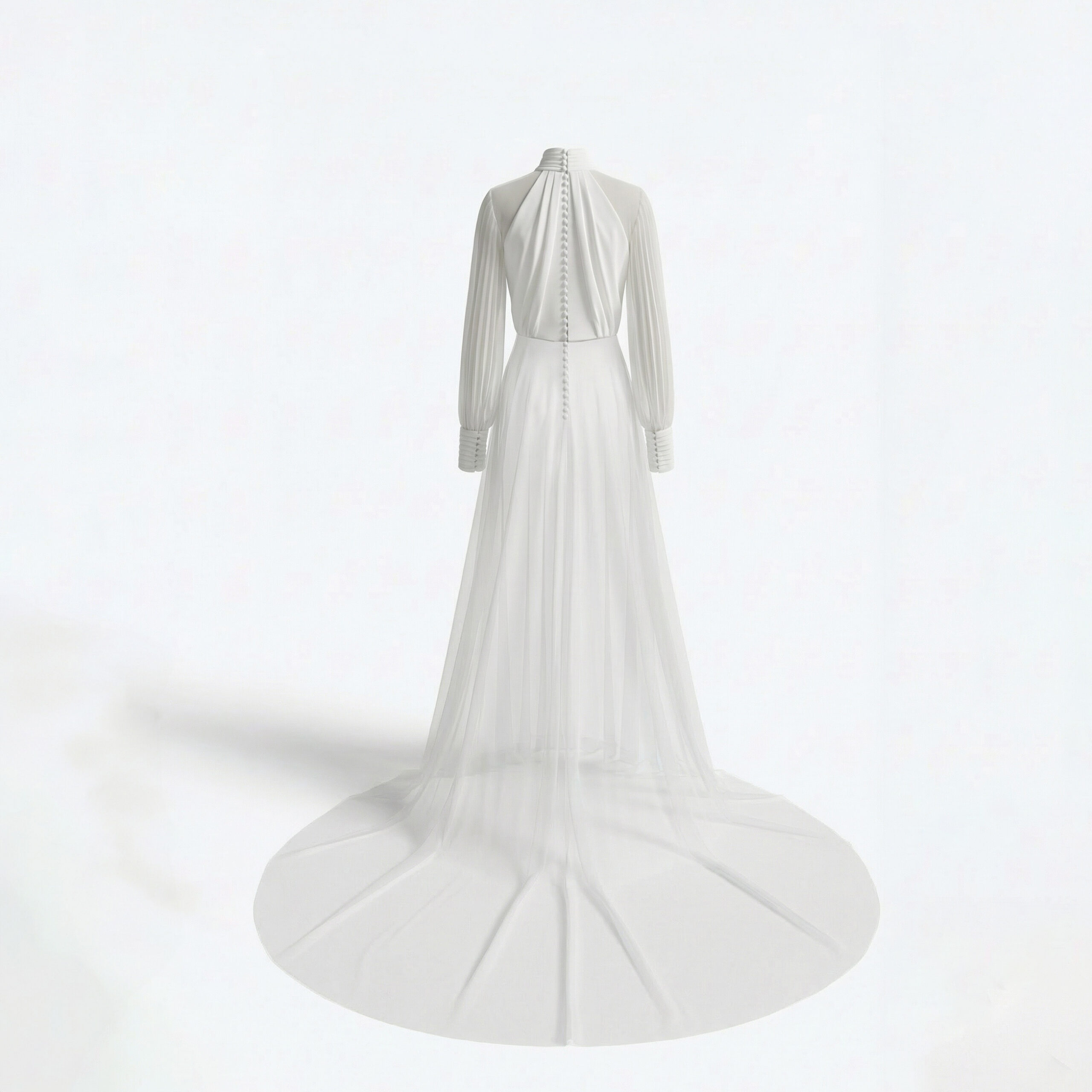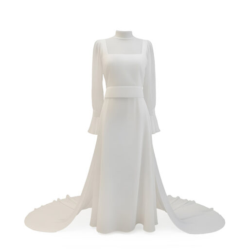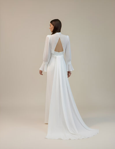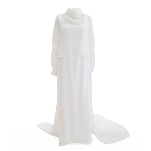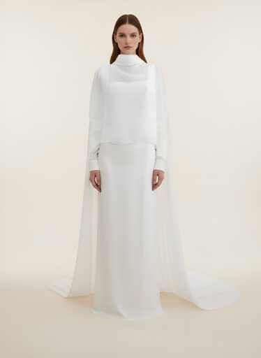 Capa de novia en muselina de seda, con drapeado en escote y puños. Mangas ranglan y cola largo 2 metros desde cintura.