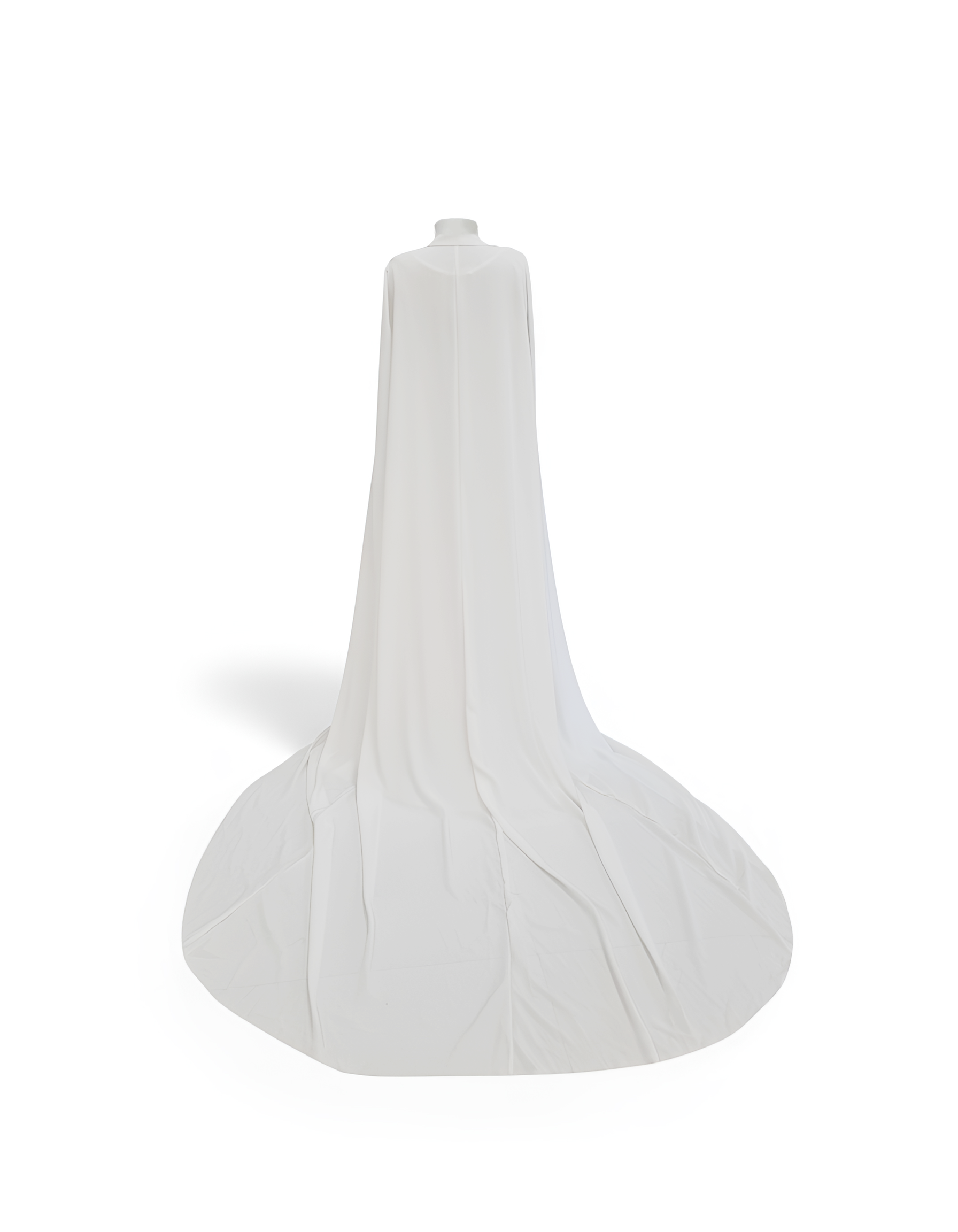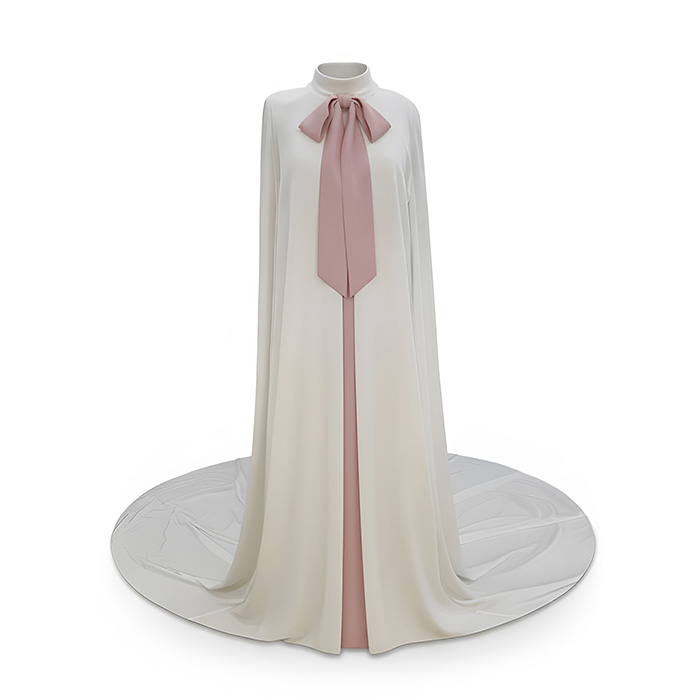 Capa en tejido satinado con lazada gasa catiónica en tono rosa empolvado. Largo de cola 1,5 metros desde cintura.