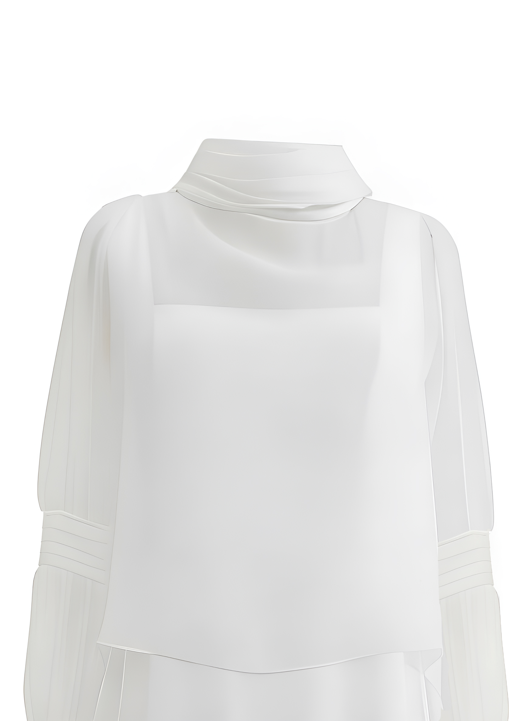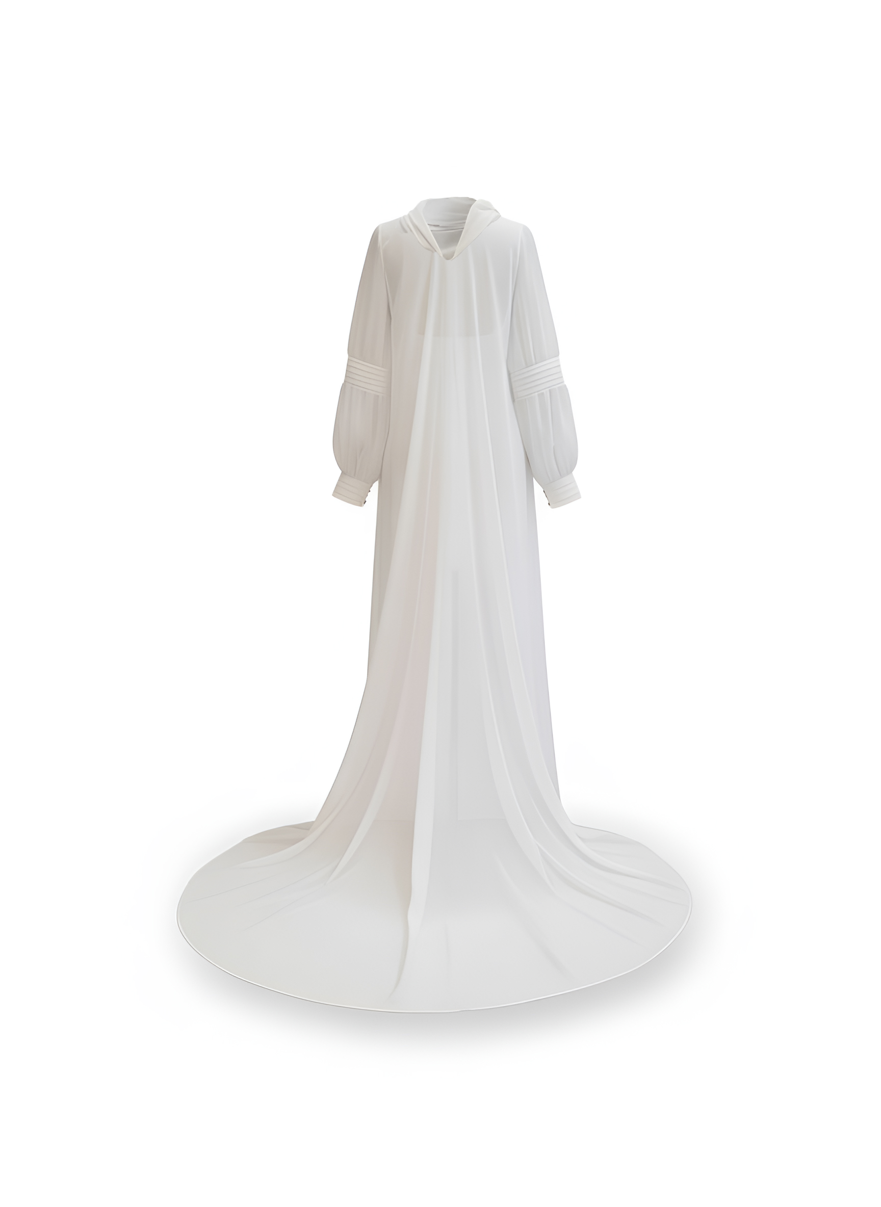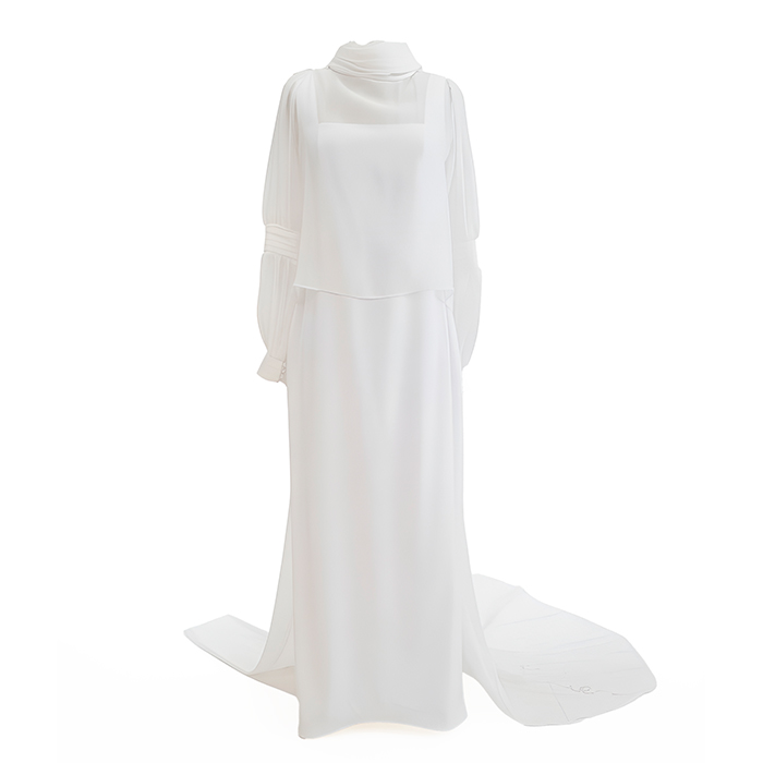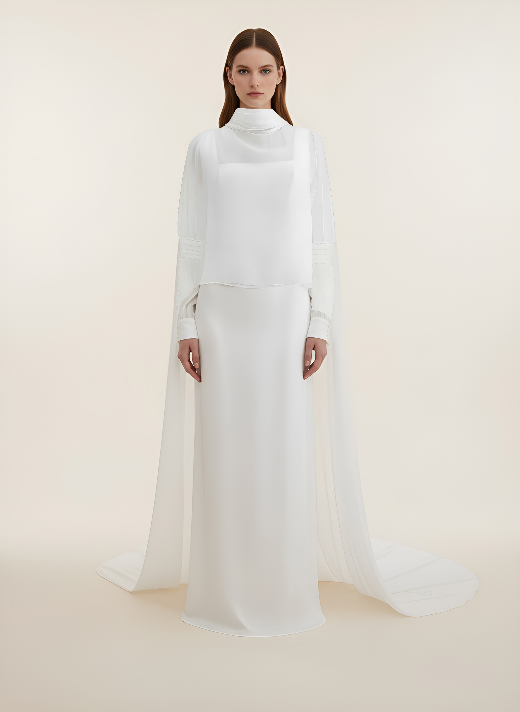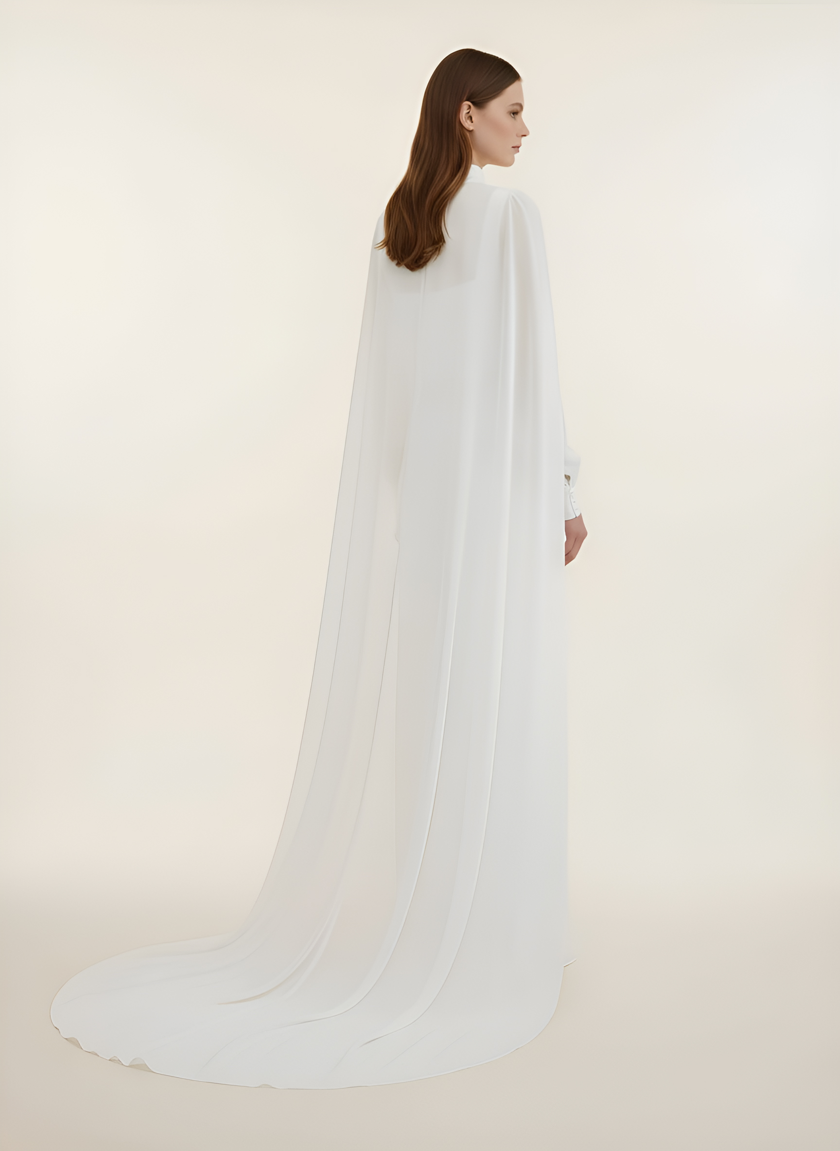 Capa de novia en organza de seda. Largo delantero a cintura y cola 2 metros desde cintura. Cuello drapeado al bies y detalle de jaretas en mangas.
