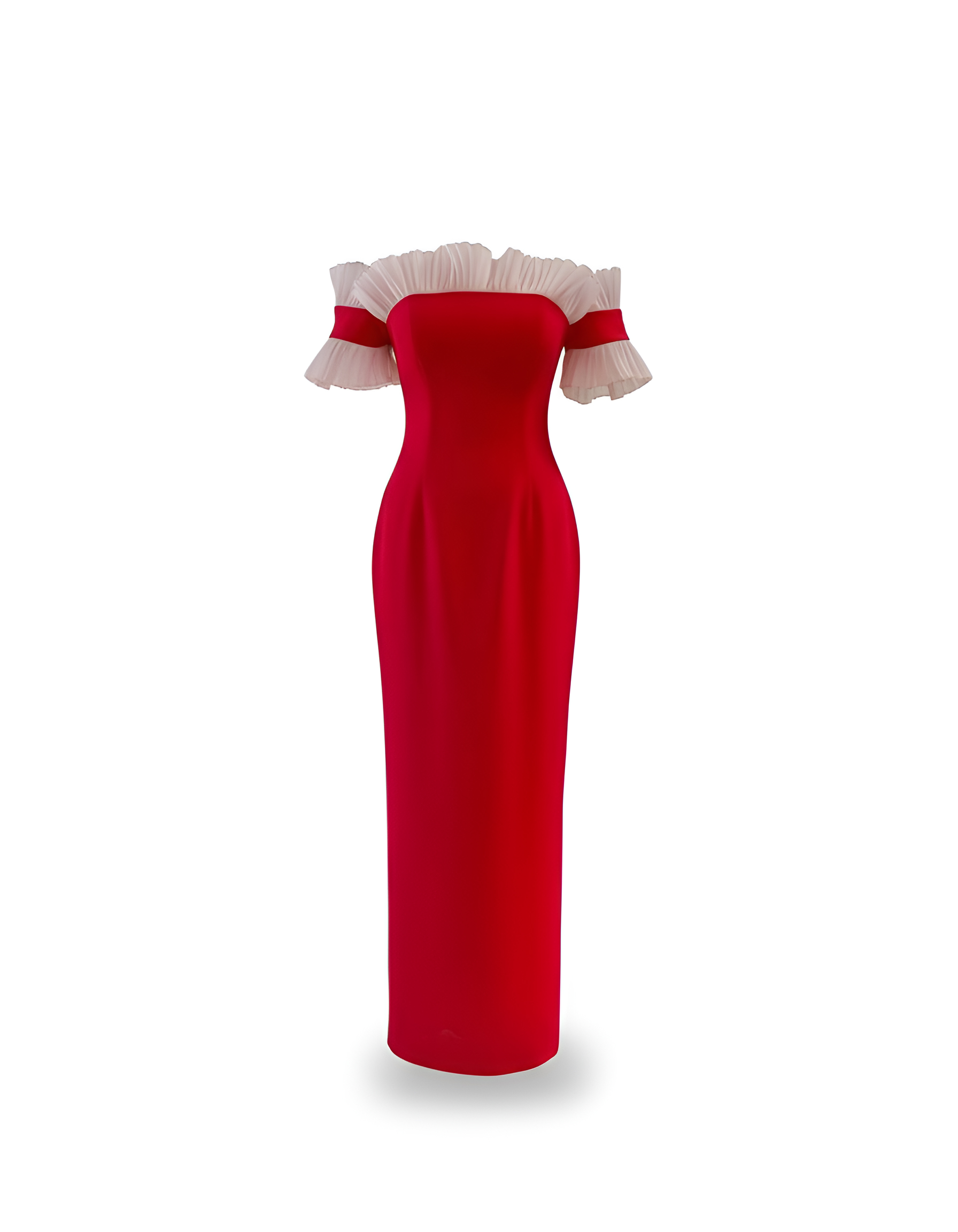 Vestido lápiz en crepe rojo con detalles de organza de seda, plisada artesanalmente en color rosa empolvado.