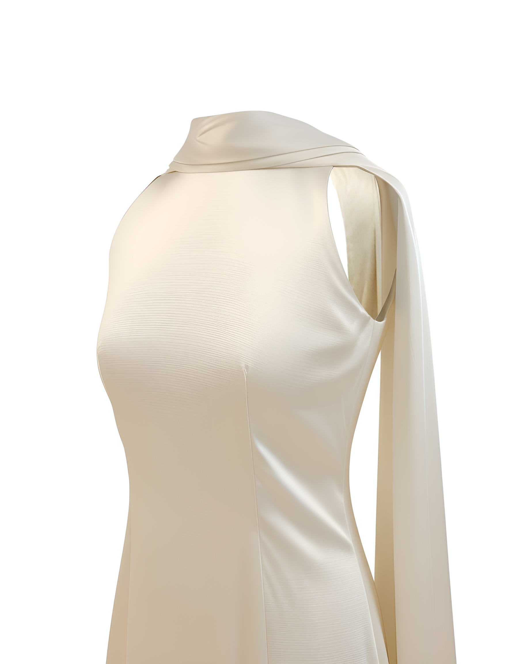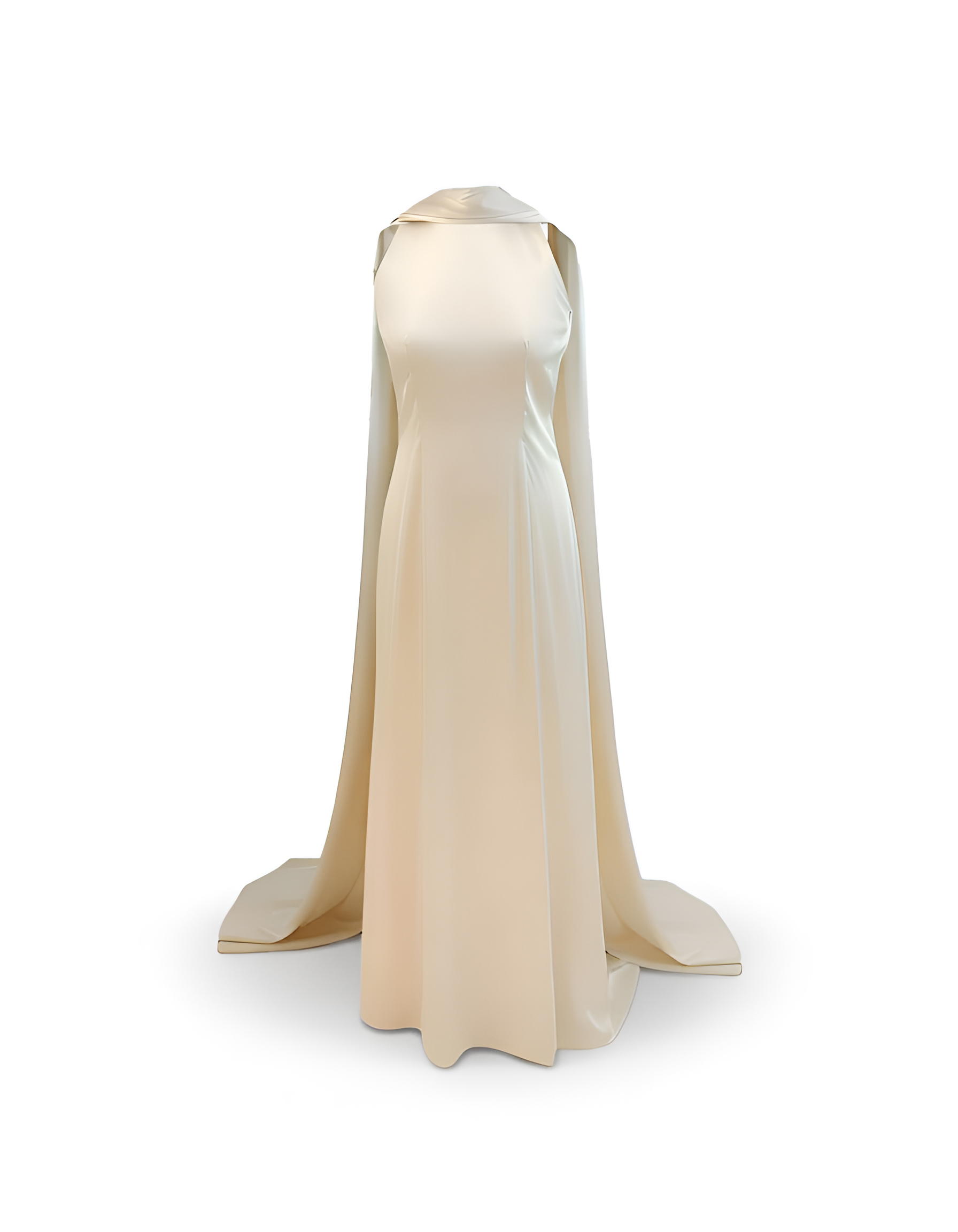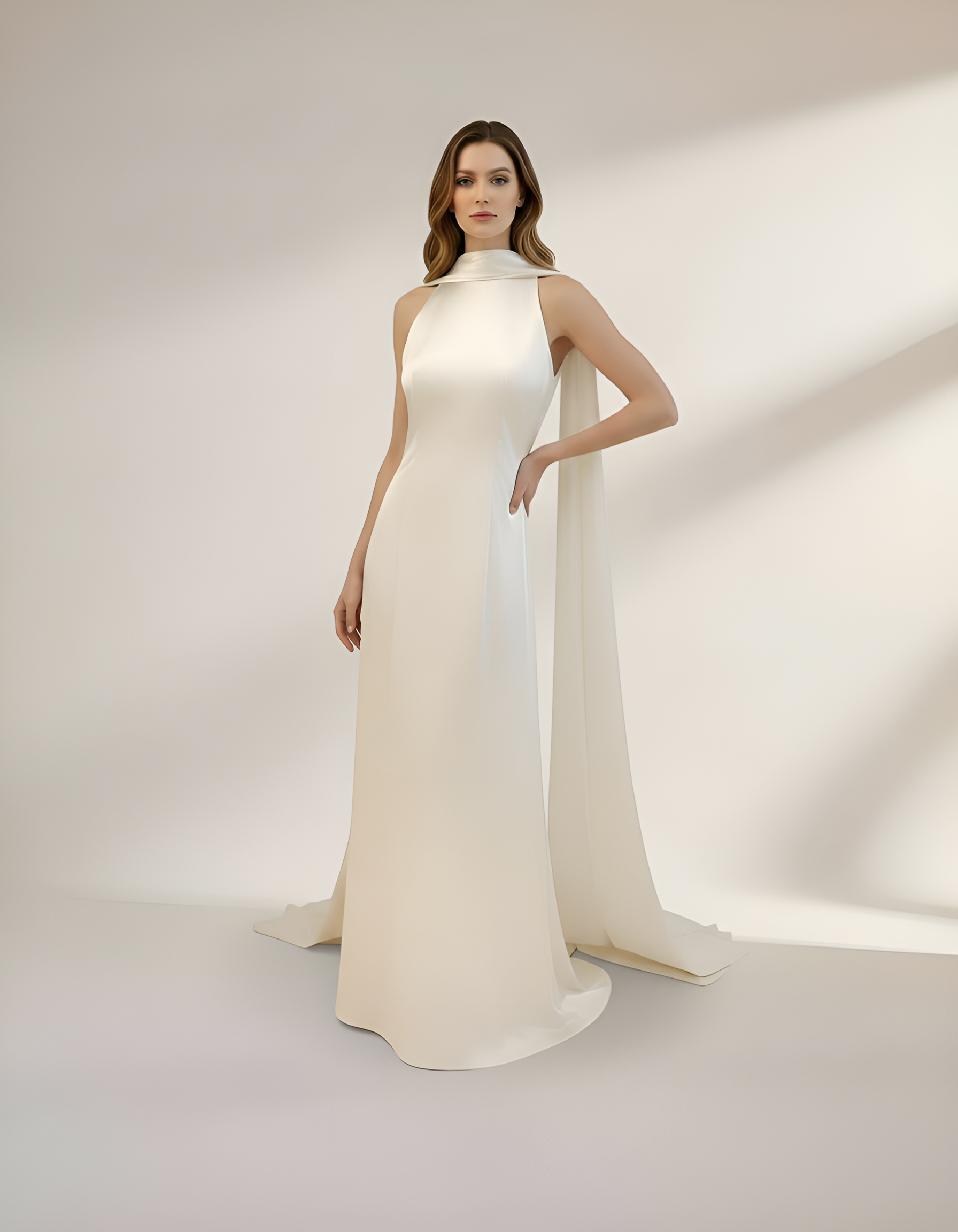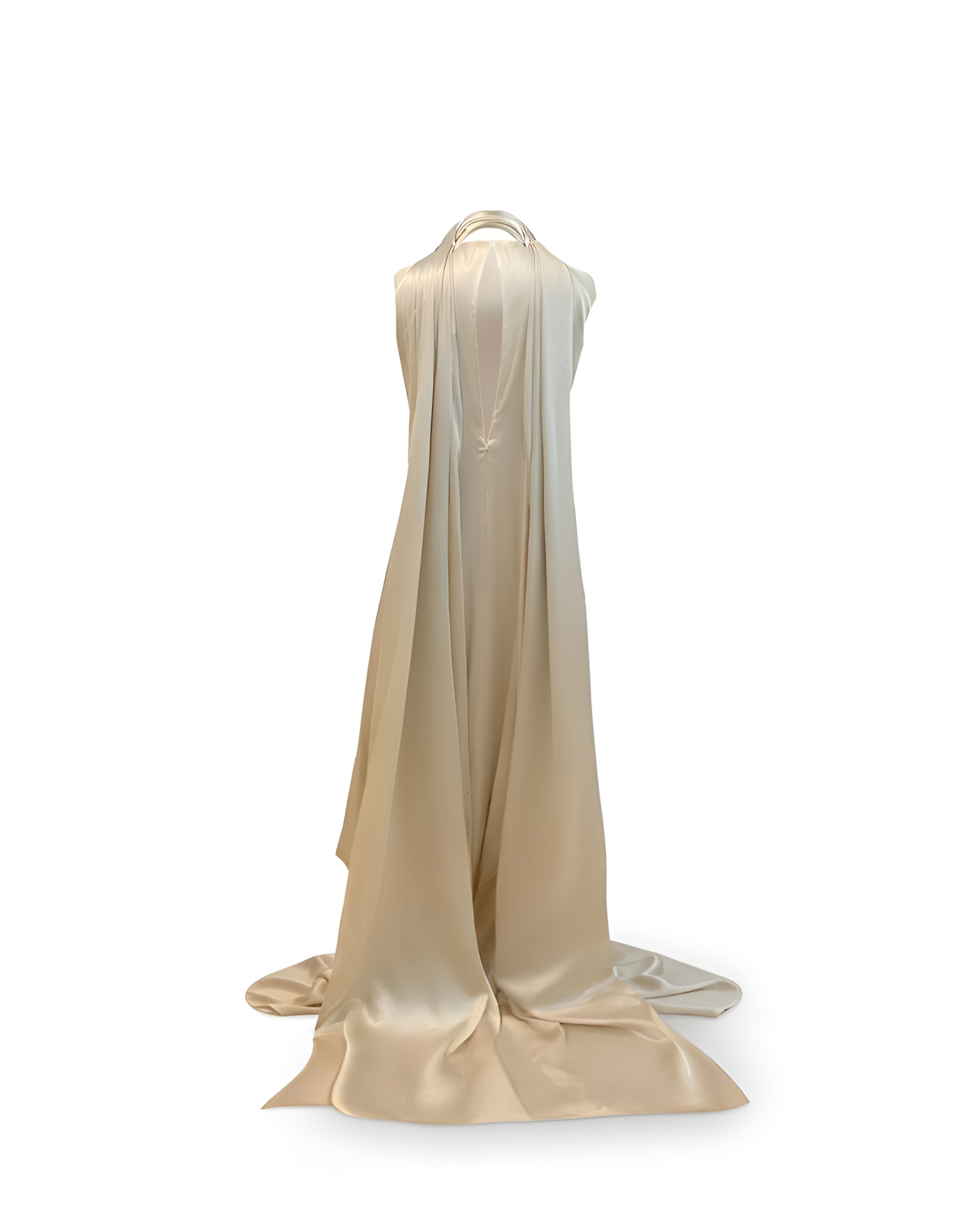 Vestido largo en satén de seda satinado, en color champán combinado con fular drapeado en el cuello.