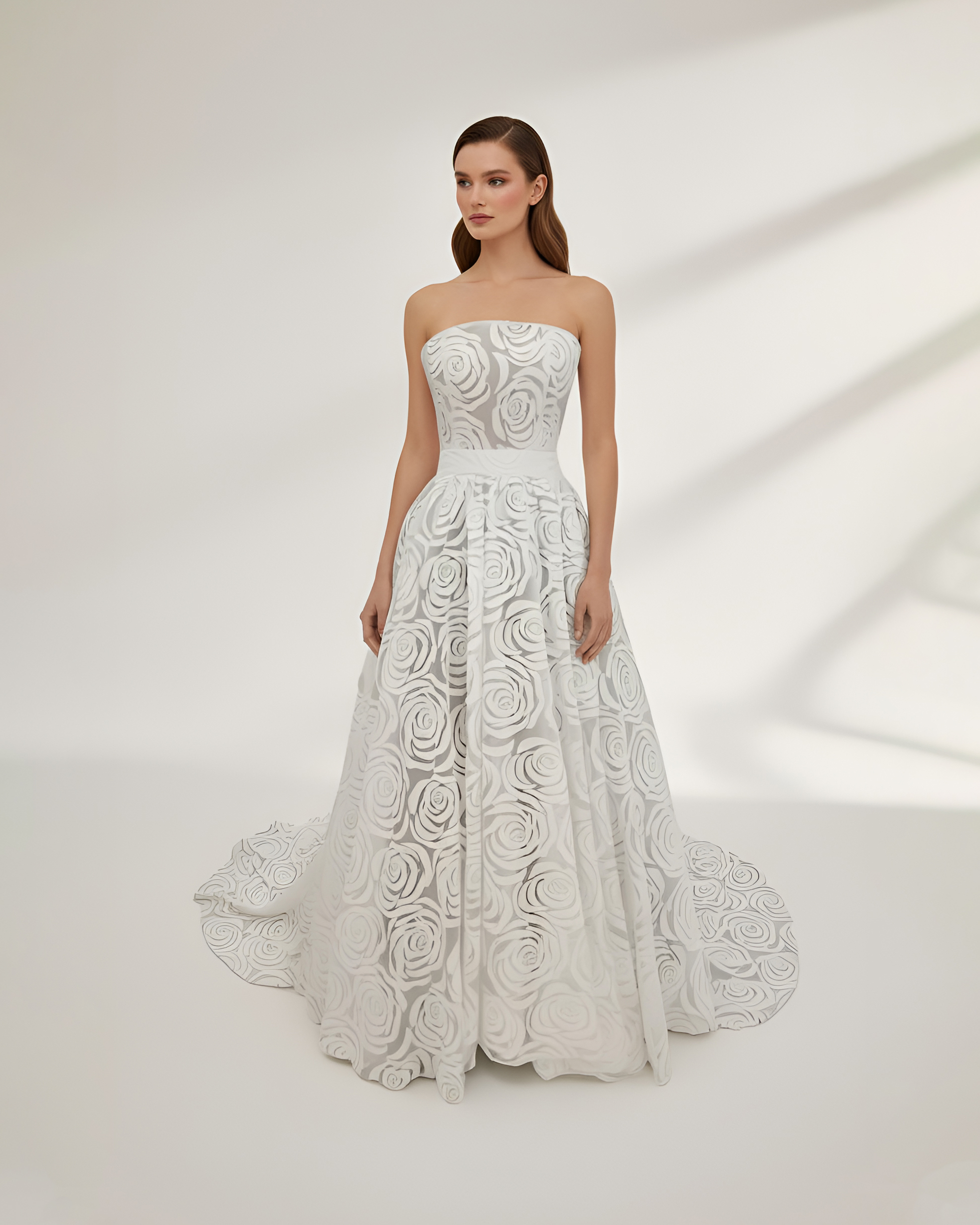 Vestido de novia con cuerpo estructura corset. Escote en palabra de honor, falda capa con mucho volumen, cancán interior y largo de cola 1,5 metros desde cintura.