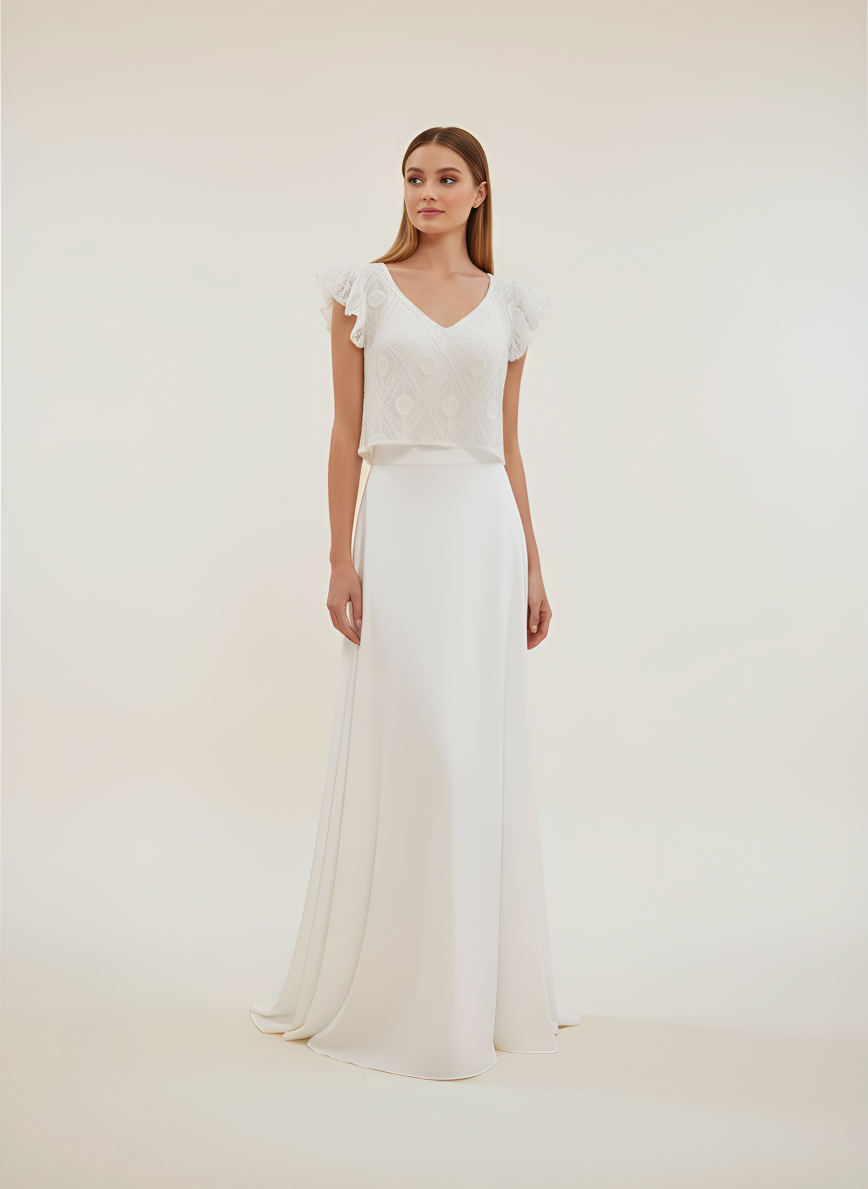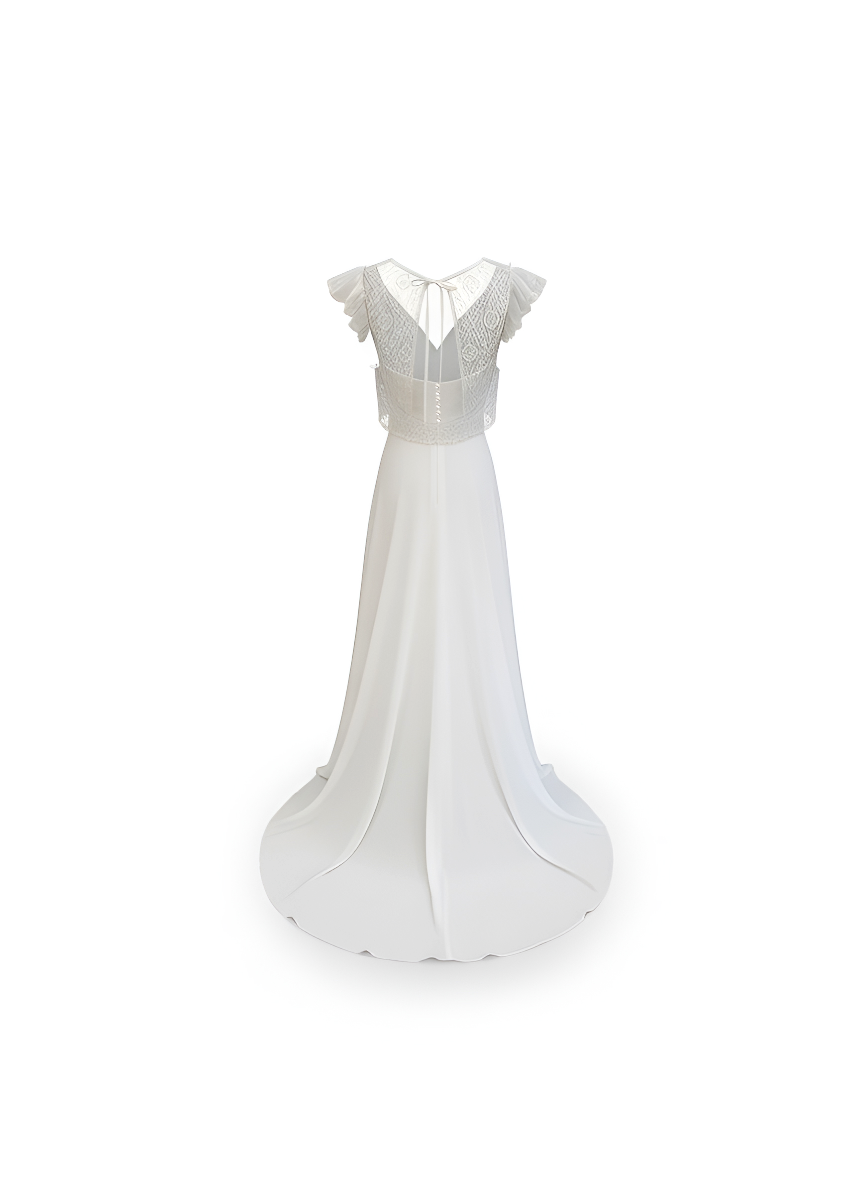 Vestido de novia con sobrecamisa anudada a la espalda.